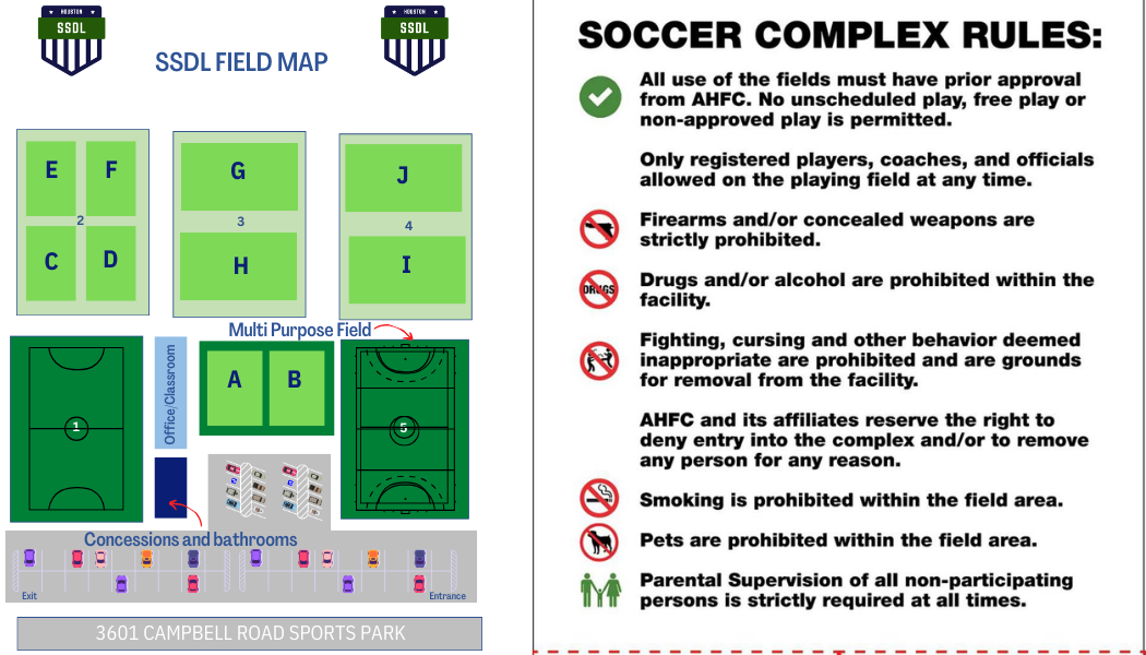 Spectators: Spectators must remain in the designated viewing areas and at least three (3) yards back from the sideline at all times. No spectator is permitted behind the goals, on the field, or in the common area between fields at any time.